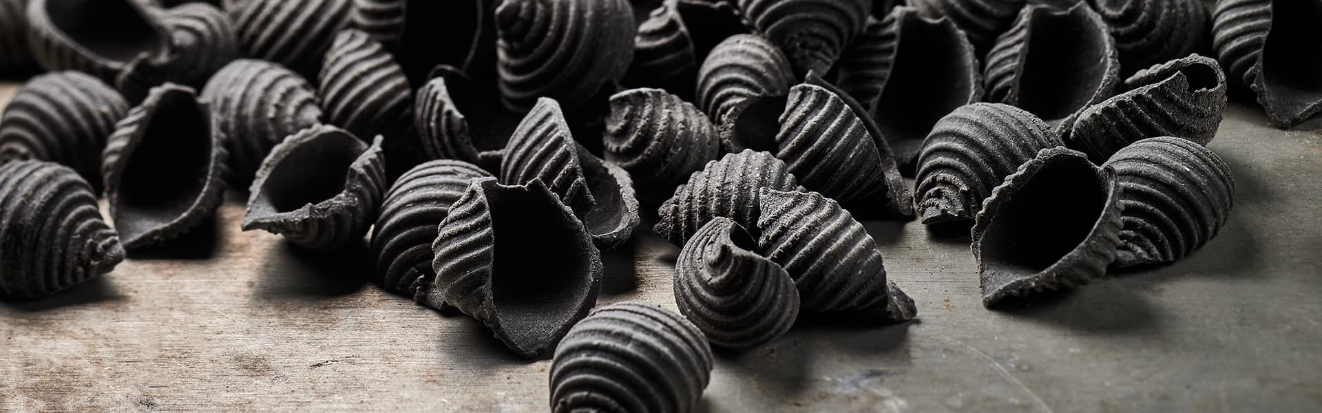 Pâtes à faire cuire et à consommer chaudes ou froides de couleur noire.Semoule de blé dur.